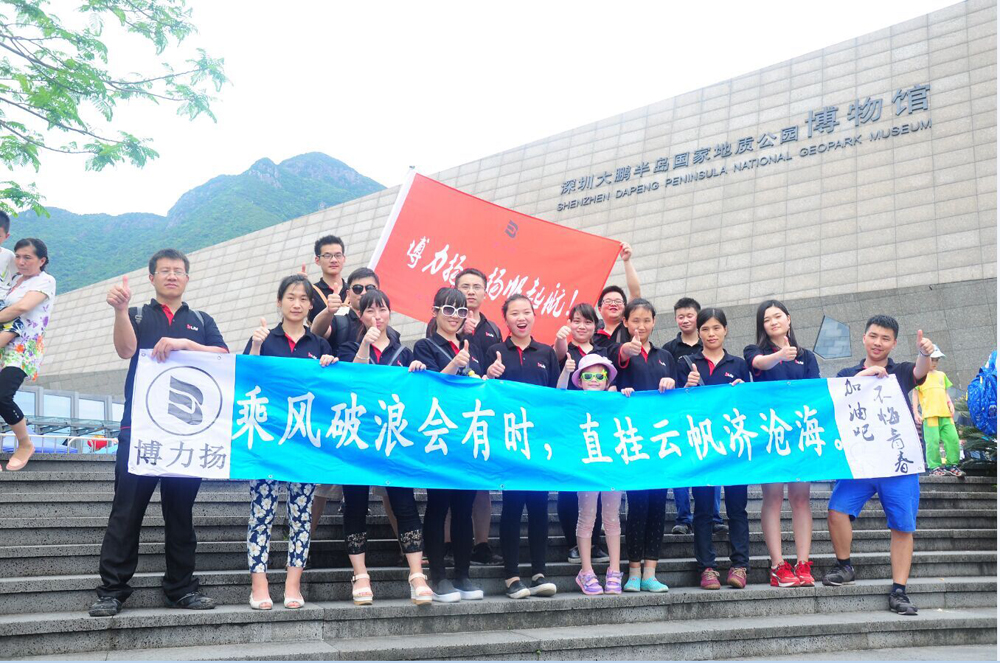 随着深圳市博力扬光电技术有限公司的发展,公司同事与公司规模也在不断扩大。同样的一块铁,可以锯融消损,也可以百炼成钢;同样的一支队伍,可以碌碌无为,也可以大有可为,为了塑造团队精神,增强服务意识,培养良好的服务态度,磨练坚韧不拨的信念,加强团队间的向心力与凝聚力,提高团队的执行力和协作能力,激发团队成员积极主动迎接挑战的正面态度;形成积极向上、团结互助、战斗力超强的团队气氛。公司于2016年5月8号组织了此次"团队协作,放飞梦想”的户外拓展训练活动。